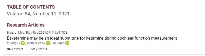 第二篇RESEARCH ARTICLES“Esketamine may be an ideal substitute for ketamine during cochlear function measurement”于2021年04月21号投稿,2021年06月21日接收,从投稿到接收用时2个月时间。