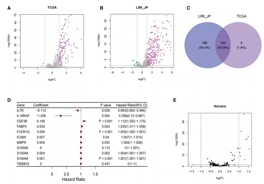作者分析TCGA和LIRI_JP在HCC免疫亚型中的差异基因,如下图A、B所示。TCGA 中有 139 个差异表达的免疫基因(DEIG), LIRI_JP 中有 300 个 DEIG,两个数据集交集有 134 个共同的 DEIG,如下图C所示。基于单变量Cox回归分析,我们发现11个DEIG主要与细胞粘附、细胞识别和信号转导相关,其中IL7R和IL18-RAP的危害比(HR)小于1,而其余 9 个差异基因的 HR 大于 1,如下图D所示。