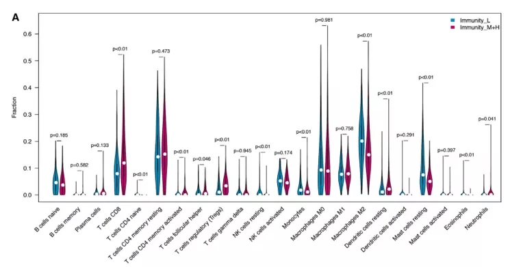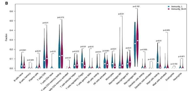 CIBERSORT用于计算TCGA和LIRI_JP数据集中HCC亚型的免疫细胞比例。我们发现某些免疫细胞明显在Immunity_H和Immunity_M组中更高,例如CD8T细胞、激活性记忆CD4T细胞。相反,幼稚CD4T细胞、单核细胞和静息细胞在Immunity_L组中更低。