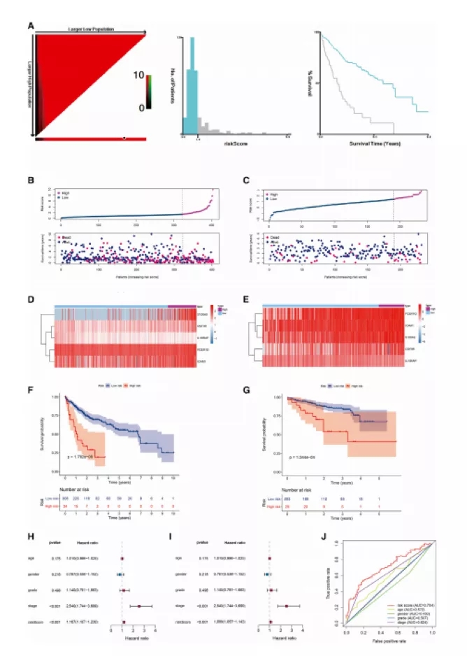为构建多风险评分模型,作者使用多元Cox回归分析并选择1.4作为风险评分截止点,基于风险评分模型将HCC患者分为两组:TCGA 和 LIRI_JP 数据集中的高风险和低风险组,如下图A-C所示。通过LASSO回归分析,筛选出5个差异表达的节律基因(DERGs)(S100A9、CSF3R、IL18RAP、FCER1G和ICAM1)。此外,作者通过 GSEA 量化了两个组中的五个 DERG 的富集水平,结果显示热图中的软件 DERG 的水平完全不同,如下图D、E所示。此外,Kaplan-Meier 分析表明,在 TCGA和 LIRI_JP 中,高风险患者的存活时间更短,存活率更低,如下图F、G所示。同时,作者对TCGA中的一些变量(年龄、性别、等级、分期和风险评分)进行了单变量和多变量Cox分析。单变量Cox分析,肿瘤分期和riskscore与存活率相关,如下图H所示。此外,多变量Cox分析表明肿瘤分期和风险评分与OS相关,如下图I所示。根据ROC曲线的AUC的比较,作者还确定了风险评分(AUC=0.704)比其他HCC预后因素更准确地预测死亡率,如下图J所示。