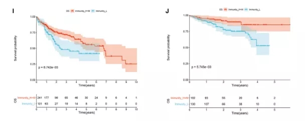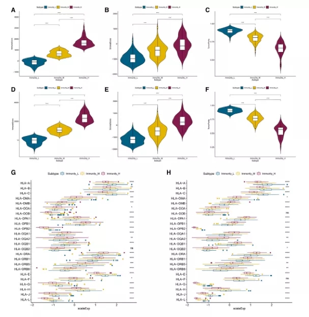 最近的研究表明,肿瘤浸润免疫细胞在癌症发展过程中发挥着特定的作用,与肿瘤微环境 (TME) 中的基质细胞相互作用。作者分析了三个 HCC 亚型的肿瘤微环境。根据小提琴图,作者发现在两个数据集中,Immunity_H比Immunity_L组的免疫得分显著高,如下图A、D所示。此外,当比较三种HCC亚型的基质评分时,基质评分从Immunity_L到Immunity_H显著增加,如下图B、E所示。肿瘤纯度从Immunity_H到Immunity_L逐渐增加,如下图C、F所示。同时,我们发现无论是在TCGA还是LIRI_JP数据集中,大部分人类白细胞抗原(HLA)基因在Immunity_H中的表达水平较高,在Immunity_L中显著降低,如下图G、H所示。Kaplan-Meiersurvival analysis显示不同的HCC亚型有不同的生存概率和生存预后,如下图I、J所示。