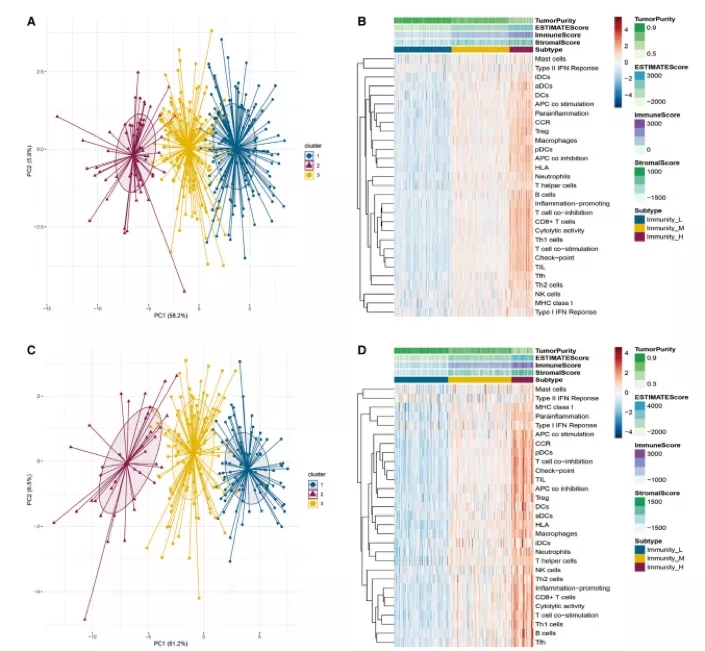 我们使用单样本基因集富集分析 (ssGSEA) 来筛选和分析 29 种免疫相关通路。获得的 ssGSEA 分数代表了免疫细胞的活性或浸润水平。基于29种免疫相关通路的GSEA分数,作者进行了HCC数据集的层次聚类。有趣的是,两个数据集的聚类结果相似,患者被分为三个独特的免疫特征,如下图所示。