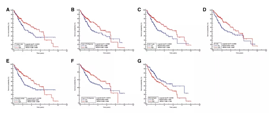 我们在 TCGA 中筛选出 7 个与 HCC 的总体存活 (OS) 相关的显著免疫相关通路(细胞、IIFN 反应型、CD8+T 细胞、B 细胞、细胞溶解活性、II 型IFN 反应、巨噬细胞)并绘制了生存曲线,重要的是,我们发现高表达水平的免疫相关通路(除了巨噬细胞)的患者生存预后更好,如下图所示:
