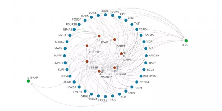 许多研究表明,转录因子参与细胞内信号转导,并通过释放大量细胞生长促进因子促进肿瘤转移和发展。我们通过绘制HCC免疫亚型中的火山图确定差异表达的转录因子基因(TFGs)。同时,我们通过单变量Cox回归分析筛选了TCGA中差异表达的免疫相关基因(IRGs)。为了评估HCC中IRGs和TFGs之间的关系,进行了一个IRGs-TFGs网络,包括9个IRGs和36个TFGs。结果显示IL7R受11个TFGs的调控,包括EGR1、EGR2、FOS、JUNB、KLF4、MYH11、NR4BTFs、RARG、SOX17、SPIB和VDR。然而,上调基因IL18RAP受两种TFGs调控,包括EGR2和JUNB,如下图F所示。这种现象表明 IL7R 和 IL18-RAP 可能具有不同的调节免疫保护的机制。