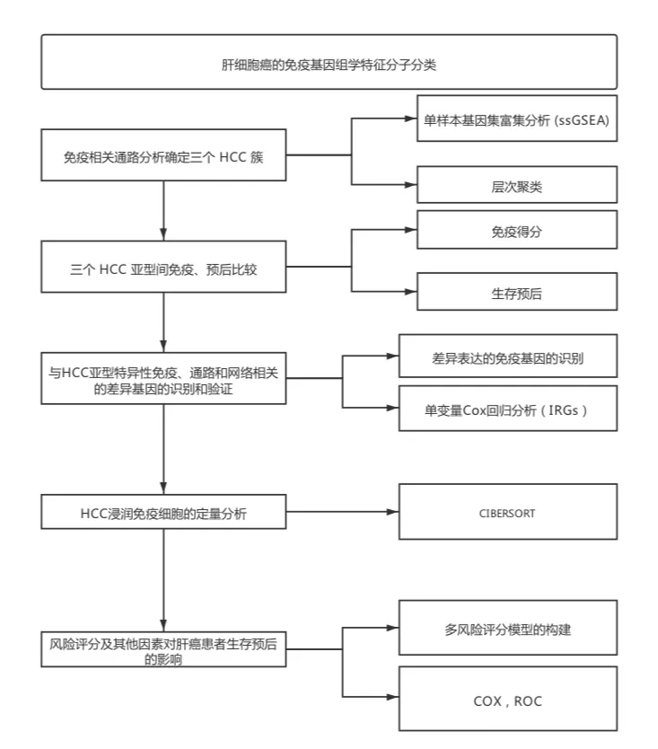免疫作用对肿瘤发展很重要。在本研究中,作者旨在研究基于免疫特征的肝细胞癌 (HCC) 的分子分类及其预后价值。基因富集分析 (GSEA) 用于计算 HCC 的核心免疫通路和两个数据库(TCGA、LIRI_JP)中的分层聚类。作者还计算了免疫微环境分数和22个免疫细胞的比例。单样本GSEA(ssGSEA)被用来筛选生存预后相关的免疫通路并计算不同表达的免疫相关基因(IRGs)的危害,这是对临床样本和多个数据集进行验证的。根据免疫特征,我们确定了三个HCC亚型,即免疫高(Immunity_H)、免疫中(Immunity_M)和免疫低(Immunity_L),并确认分类是可靠和可预测的。Immunity_H有着更高的免疫和基质得分,暗示出更好的生存率。COX回归分析表明IL18RAP和IL7R是保护基因。免疫风险评分是HCC患者总体生存的独立危险因素。这些结果表明,免疫基因组学分类可以区分免疫状态不同的 HCC 患者,这可能会影响 HCC 患者的预后。