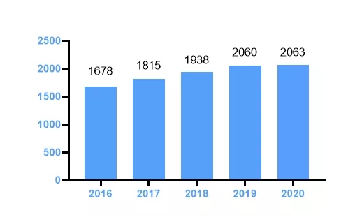 2016 (1678),2017 (1815),2018 (1938),2019 (2060),2020(2063)