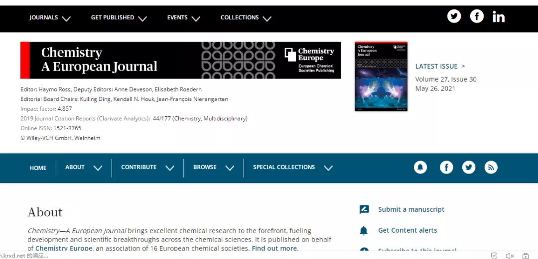 今天,我们来看看这本SCI期刊:CHEMISTRY-A EUROPEAN JOURNAL。从现有的记录来看,CHEMISTRY-A EUROPEAN JOURNAL 的2021年影响因子(JCR2020)是5.236。