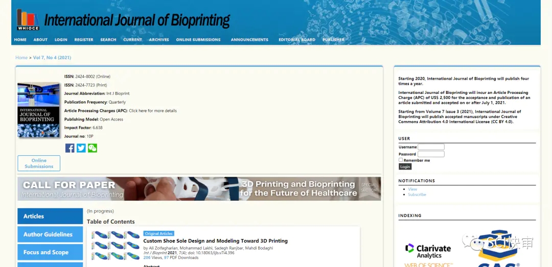 International Journal of Bioprinting,ISSN: 2424-7723,E-ISSN:2424-8002;出版国家:新加坡;由WHIOCE PUBLISHING PTE LTD, SINGAPORE出版。2020年获得第一个影响因子,为6.638 。