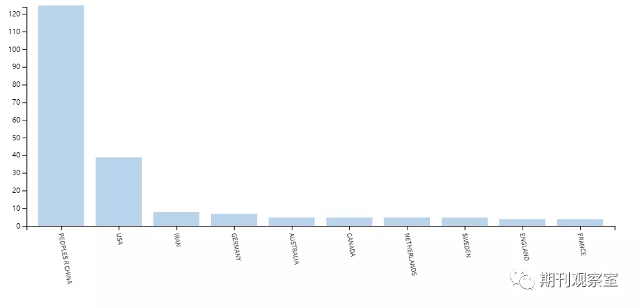 针对期刊2019、2020年度所刊的论文(178篇),统计作者所属的国别信息,如下图所示。中国、美国、伊朗分别发文124篇、38篇、7篇。