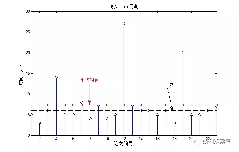 统计所有论文的二审周期,如下图所示,其中最短时间为3天,最长周期为27天。基于平均数、中位数得到的二审周期统计时间分别为7、6天。综合两种方法,二审平均周期为7天时间。