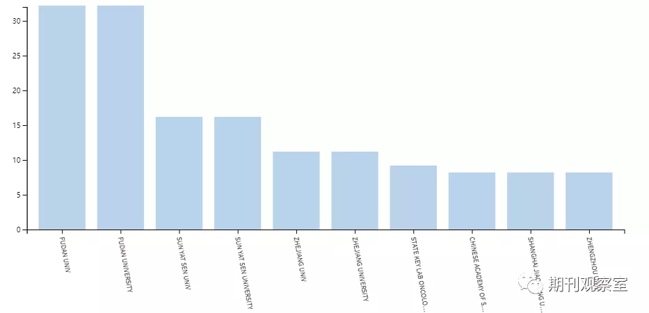 针对期刊2019、2020年度所刊的论文(178篇),统计作者所属单位,如下图所示。复旦大学、中山大学、浙江大学分别发文32篇、16篇、11篇。