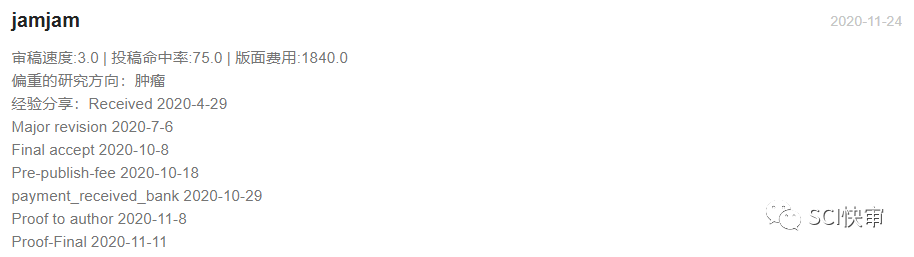 International Journal of Medical Sciences当前为月刊,官网未表明审稿周期;通过对近期已发表文章审稿速度的抽样统计,大部分文章的审稿周期都是在2-3个月左右便可接受,快的不到1个月便可接收,慢的也仅需要3个多月的,总的来说审稿速度整体较快,且审稿周期差异不大。