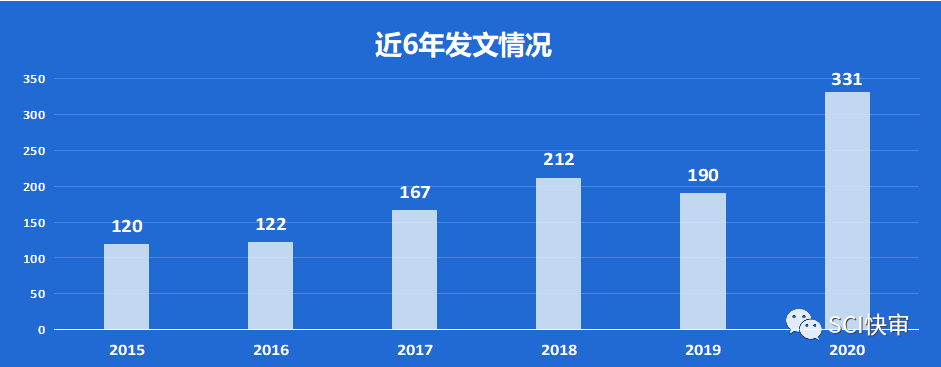 International Journal of Medical Sciences近6年发文量整体呈上升趋势,2015年至2017年发文量均为100多篇,2018年突破200篇,2019年虽然稍微缩篇了一点,但是2020年发文量上涨不少,突破300篇。2020年国人发文占比59.34%。