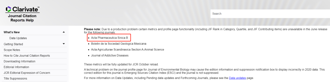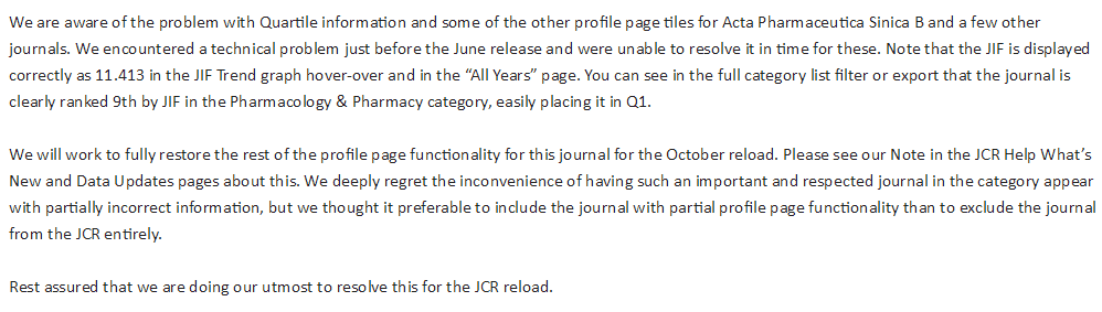 2021年6月30日,科睿唯安(Clarivate Analytics)发布了2020年期刊引证报告(Journal Citation Reports,JCR),《药学学报》英文刊(Acta Pharmaceutica Sinica B, APSB)2020年影响因子为11.413。同日,科睿唯安发布新闻(见下图),由于其生产过程出现问题,APSB在分区上显示错误,官网将于10月更新正确信息。同时,编辑部与科睿唯安进一步联系,确认获悉,依据学科影响因子排序,APSB位列全球275本Pharmacology & Pharmacy学科类期刊第9名, 应位于Q1区。由于影响因子与分区的不统一为广大同仁带来困惑而表示歉意!