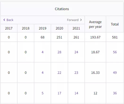 目前,这本杂志2019,2020年的文章在2021年的总引用数为261次(09月22日),文章数目是63篇。所以计算的即时影响因子是261/63=4.142857分。
