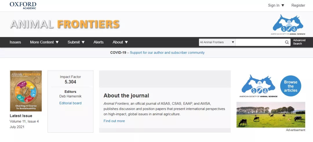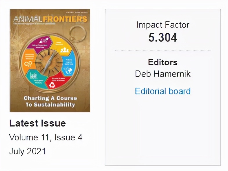 Animal Frontiers期刊主编为内布拉斯加大学林肯分校(University of Nebraska Lincoln)的Deb Hamernik 。