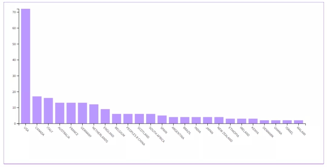 根据Web of Science收录的论文来看,目前发文量最多的是美国学者72篇,占比约40%,其次是加拿大学者17篇,占比约9%,发文量居第三位的是意大利学者发文16篇,目前,中国学者发文共6篇,位居第9位!