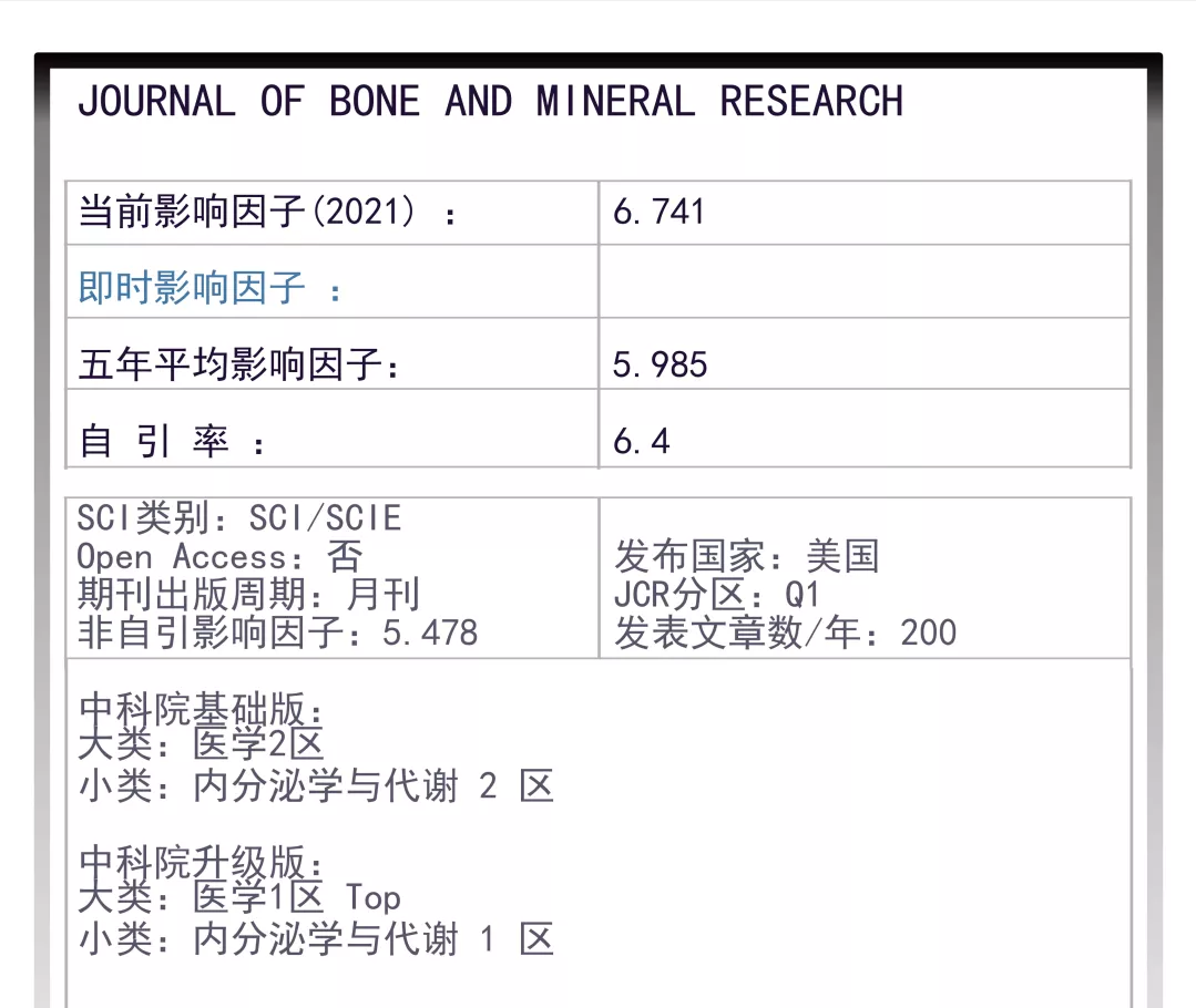 今天我们来分析一下 Journal of Bone and Mineral Research 。美国医学-内分泌学与代谢学类期刊 Journal of Bone and Mineral Research(ISSN:0884-0431 eISSN:1523-4681)是本老牌期刊,创刊于1986年,发表关于与肌肉骨骼系统和矿物质代谢相关的基础、转化和临床研究,是美国骨与矿物研究学会(ASBMR)的官方期刊,每年发行12期,主编是来自Sydney M. & Stella H. Schoenberg 医学、骨科外科、细胞生物学和生理学的Roberto Civitelli, MD教授。2021年期刊影响因子6.741,JCR1区,中科院1区TOP。