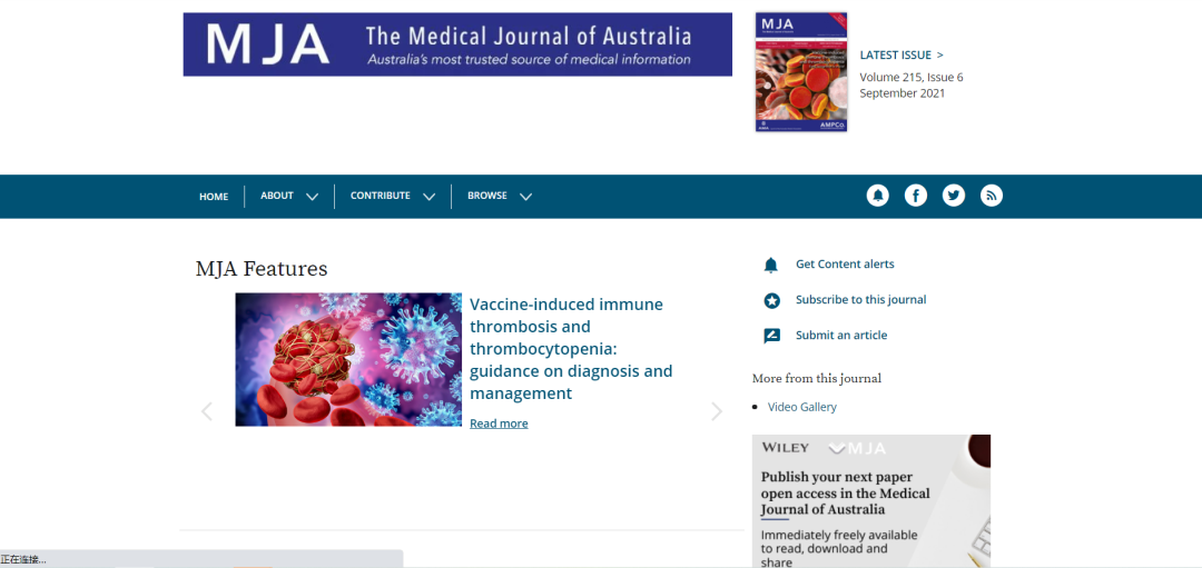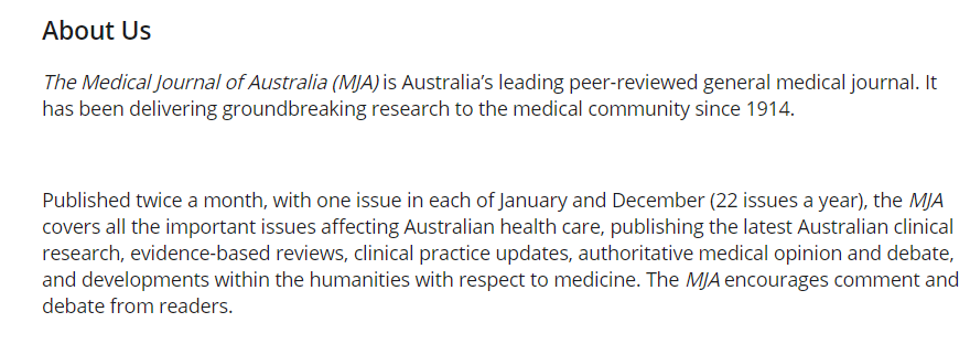 Medical Journal of Australia主要涵盖了卫生保健的所有重要问题,出版最新的临床研究、循证评论、临床实践更新、权威医学意见和辩论,以及人文学科与医学的发展。