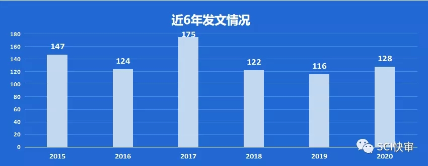 Immunology Letters近6年发文量整体变化不大,均在一百多篇,2017年发文量最高篇;2020年综述类发文量为35%左右;2020年国人发文占比为28.91%,国人相对友好。