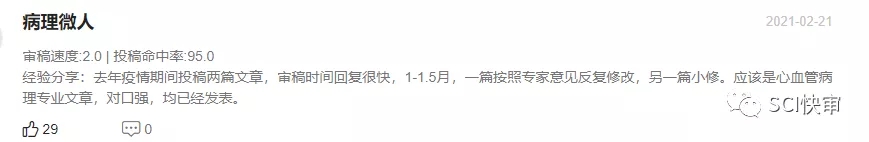 Cardiovascular Pathology当前为双月刊;官网表明从手稿提交到文章的初步决定平均为1.5周;通过对近期已发表文章审稿速度的抽样统计,发现该刊的审稿周期大部分在1-3个月左右可接受,最快的十几天就可以接受!个别慢的有4个多月,整审稿周期有快有慢,整体偏快。