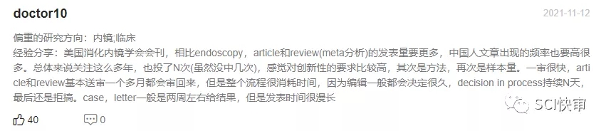 Gastrointestinal Endoscopy当前为月刊;官网表明从手稿提交到文章的初步决定平均为2.9周,从手稿提交到最终的编辑决定平均为4.6周;通过对近期已发表文章审稿速度的抽样统计,发现该刊的审稿周期大多都在2-3个月便可接受,最快的1个多月就可以接受!慢的也需要5个多月,从官网给出 的数据来看,一审周期相对较长,急者慎投。
