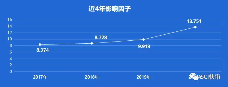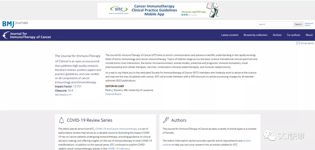 Journal for Immunotherapy of Cancer ,ISSN:2051-1426,2013年创刊,出版国家:英国,2020年1月起正式转至BMJ旗下,由BMJ PUBLISHING GROUP出版。2017年拥有第一个影响因子,影响因子上升较快,2017年与2018年影响因子为8分+,2019年突破9分+,2020年影响因子为:13.751,即时因子为9.86。
