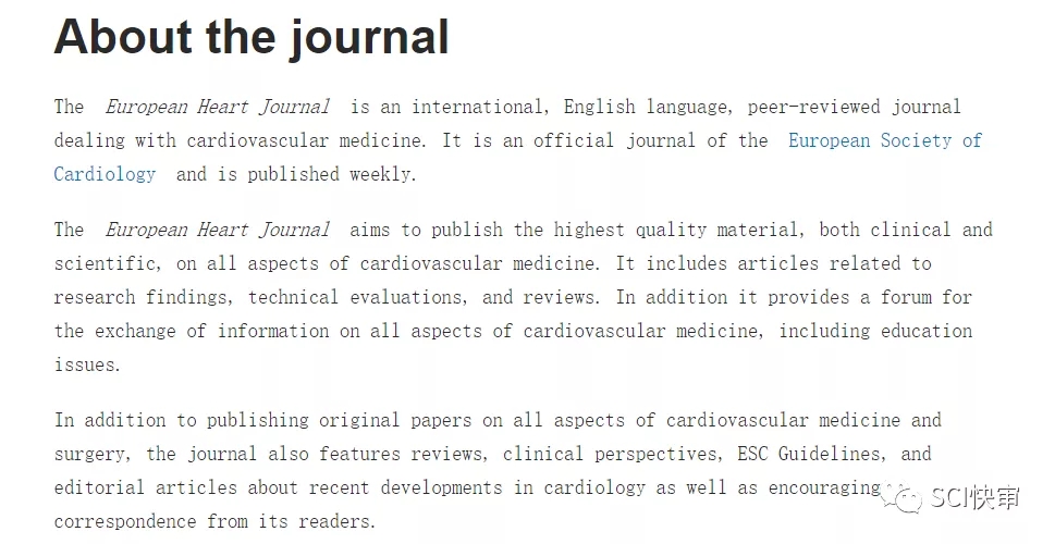 European Heart Journal是欧洲心脏病学会的官方期刊,发表心血管医学领域的最高质量的材料,临床和科学的文章。除了发表心血管医学和外科的所有方面的原始论文,该杂志还具有评论,临床观点,ESC指南,以及关于心脏病学最近发展的社论文章,以及鼓励读者来信。