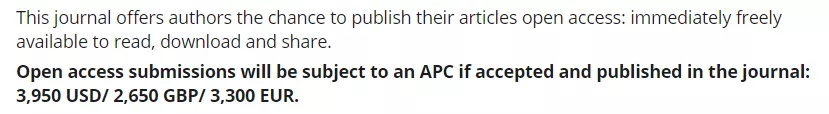 根据官网消息,IBIS是一本可以选择开放获取的期刊,每篇文章收取3,950 USD/ 2,650 GBP/ 3,300 EUR的文章处理费,折合人民币约为25160元,价格比较贵,官网近期发表的文章来看选择开放获取的期刊较少。