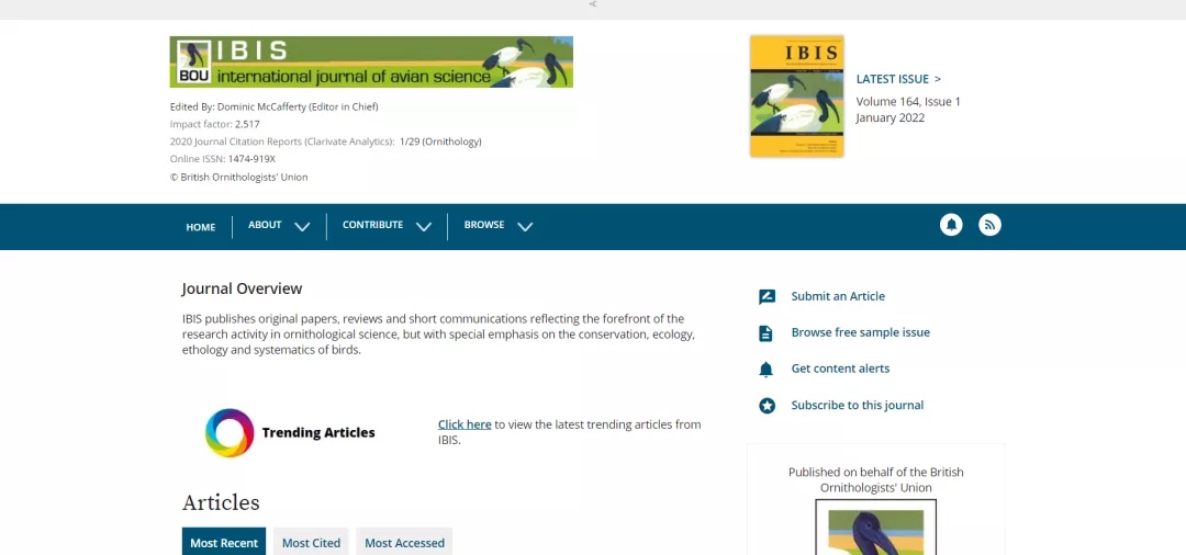 IBIS,ISSN:0019-1019,E-ISSN:1474-919X,1859年创刊,出版国家:英国;由WILEY出版。近6年影响因子均在1-2分间徘徊,2020年影响因子为:2.517,即时因子为1.1。