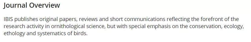 IBIS反映鸟类科学前沿研究活动的文章,关注鸟类的行为、生态、进化和保护,包括鸟类学、鸟类、鸟类、进化、遗传学、古生物学、行为学、系统学、保护、生理学的研究,但特别强调鸟类保护、生态学、行为学和系统学。