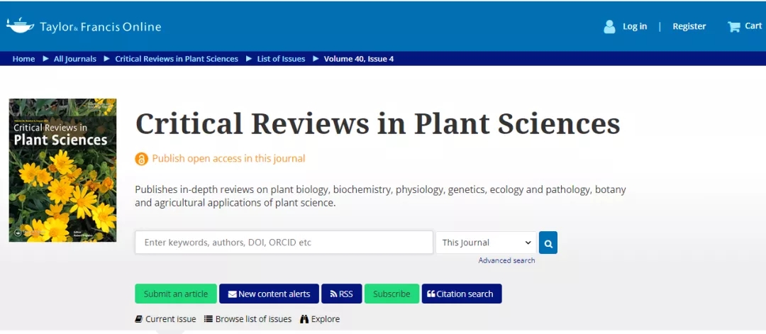 Critical Reviews in Plant Sciences focuses on presenting in-depth and up-to-date reviews of timely and/or cutting-edge subjects in the broad discipline of plant science, ranging from molecular biology/biochemistry through the areas of cell biology, plant pathology and physiology, genetics, classical botany, and ecology, to practical agricultural applications.