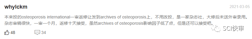 Osteoporosis International当前为月刊,官网表明从投稿到对文章做出初步决定所需的平均为36天;通过对近期已发表文章审稿速度的抽样统计,发现该刊的审稿周期大部分在1-3个月左右可接受,快的不到1个月就可以接受!慢的也有需要6个多月的,审稿速度有快有慢。