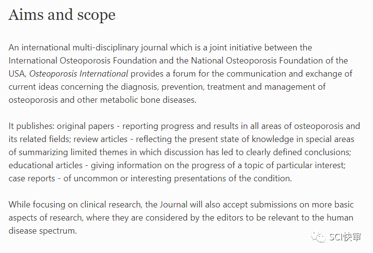 Osteoporosis International是由国际骨质疏松基金会和美国国家骨质疏松基金会联合发起的国际性多学科期刊。发表关于诊断、预防、骨质疏松症和其他代谢性骨病的治疗和管理的文章。