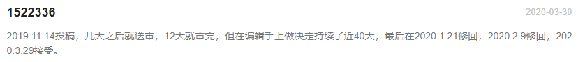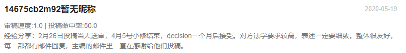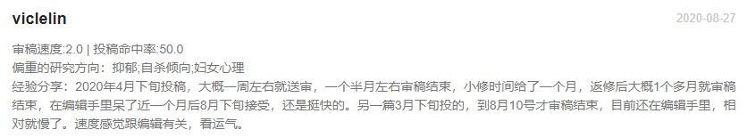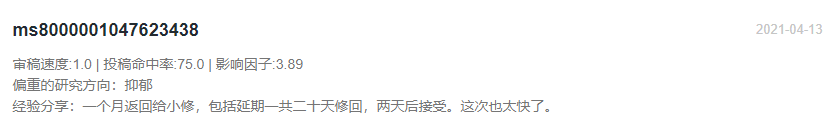 Journal of Affective Disorders当前为月刊,官网表明从投稿到对文章的初步决定平均为1.3周,从稿件提交到最终的编辑决定平均为4.3周;通过对已发表文章审稿速度的抽样统计,大部分文章的审稿周期都是在1-5个月左右便可接受,快的1个多月便可接收,慢的也有需要五六个月的,总的来说审稿速度有快有慢,审稿周期差异比较大,不适合急者投,尤其赶毕业的小伙伴慎思。