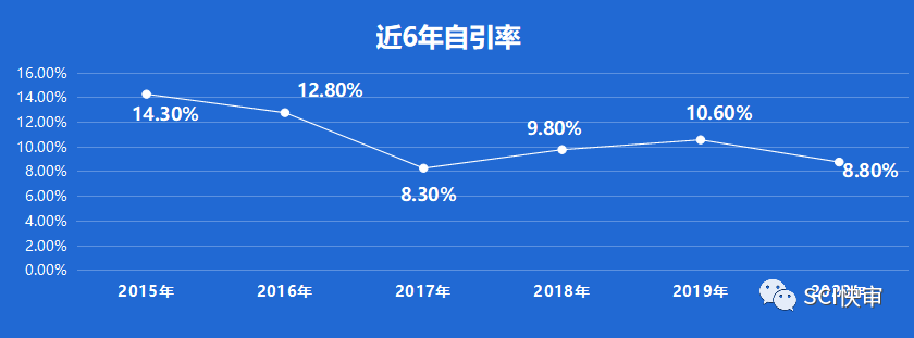 Journal of Affective Disorders近5年自引率均控制在15%以下,2015年自引率为近5年最高,近15%;2020年自引率为8.8%,总的来说自引率不算高。