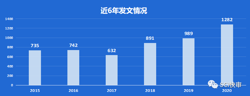 Journal of Affective Disorders近五年发文量整体呈上升趋势,2017年缩篇100多篇,2018年扩篇至800多篇,2019年继续扩篇,发文量近一千篇,2020年有较为明显的扩篇,发文量为1200多篇,2020年国人发文占比约为23.71%,国人发文占比不算多,但是按这个发文量来看也不少了。