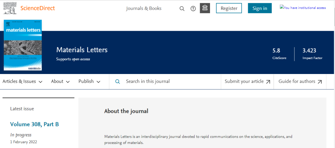 今天,我们来看看这本SCI期刊:MATERIALS LETTERS。从现有的记录来看,MATERIALS LETTERS 的2021年影响因子(JCR2020)是3.423,自引率4.59%。
