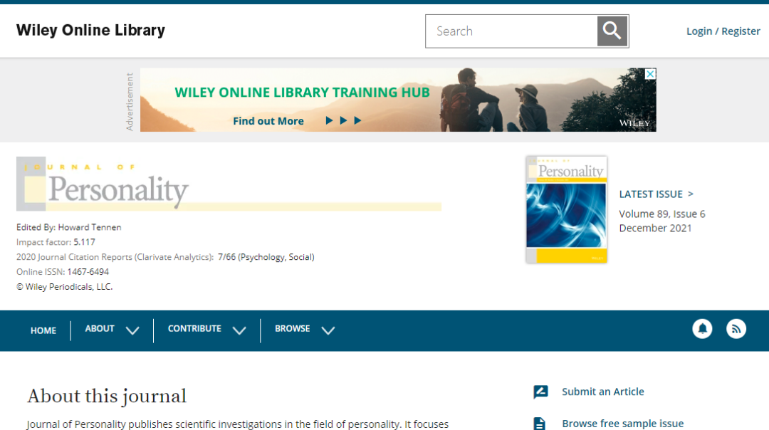 Journal of Personality publishes scientific investigations in the field of personality. It focuses particularly on personality and behavior dynamics, personality development, and individual differences in the cognitive, affective, and interpersonal domains.