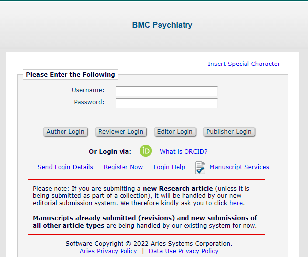 BMC Psychiatryis an open access, peer-reviewed journal that considers articles on all aspects of the prevention, diagnosis and management of psychiatric disorders, as well as related molecular genetics, pathophysiology, and epidemiology.