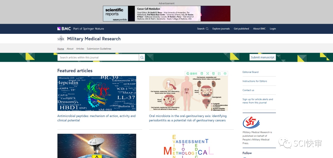 Military Medical Research ,ISSN:2095-7467,E-ISSN:2054-9369,2014年创刊,出版国家:英国;由BMC出版。2019年获得第一个影响因子,2020年影响因子为:3.329,即时因子为28.93。