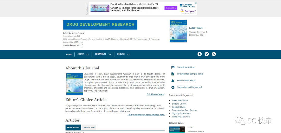 DRUG DEVELOPMENT RESEARCH,ISSN:0272-4391,E-ISSN:1098-2299,1981年创刊,出版国家:美国;由WILEY出版。近6年影响因子上涨比较快,2015年不到1分,2016年上涨至1分+,2017年突破2分,不过2018年与2019年回归1分+,2020年有较大突破,2020年影响因子为:4.36,即时因子为3.55,今年还是有望保持4分+的。