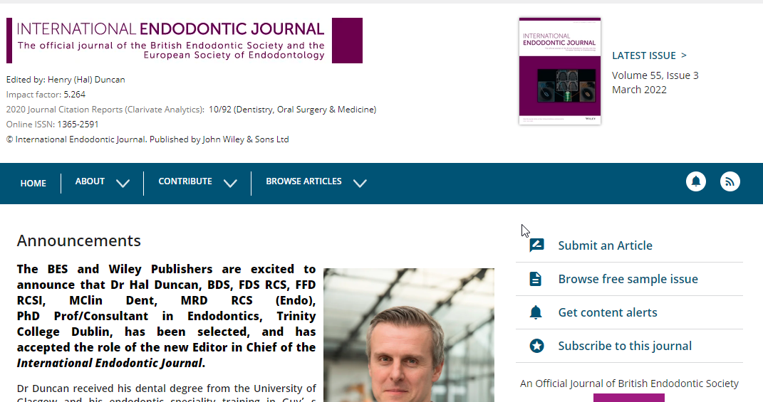 The International Endodontic Journalis a leading international forum for publications in the field of Endodontology, the branch of dental sciences dealing with health, injuries to and diseases of the pulp and periradicular region, and their relationship with systemic well-being and health.