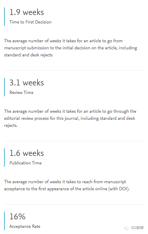 Genes & Diseases当前为季刊,官网表明从手稿提交到最初的决定所需要的时间平均为1.9周;通过对近期已发表文章审稿速度的抽样统计,发现该刊的审稿周期基本在1-3个月左右便可接受,快的1个月就可以接受!慢的甚至也有需要将近4个月的,总的来说审稿速度有快有慢,整体偏快,不过该刊的录用率比较低,官网给出的数据为16%。