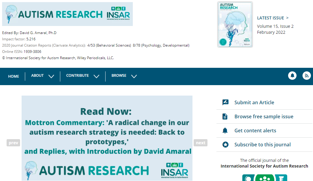 Autism Researchcovers research relevant to ASD and closely related neurodevelopmental disorders. The journal focuses on genetic, neurobiological, immunological, epidemiological and psychological mechanisms and how these influence developmental processes in ASD.
