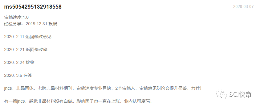 JOURNAL OF NON-CRYSTALLINE SOLIDS当前为半月刊;官网表明2021年从提交到第一次决定平均为3.9周,从提交到最后编辑决定平均为5.7周,也就是1个来月;通过对近期已发表文章审稿速度的抽样统计,大部分文章的审稿周期都是在1-2个月左右便可接受,最快的1个月就可以接受!慢的3个多月,审稿周期整体属于正常偏快。