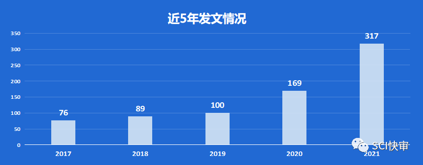 Acta Pharmaceutica Sinica B近5年发文量整体呈上升趋势,2017年至2019年发文量不多,2020年与2021年有稍微明显的扩篇趋势,综述类发文量占比28%左右。