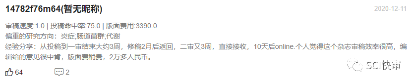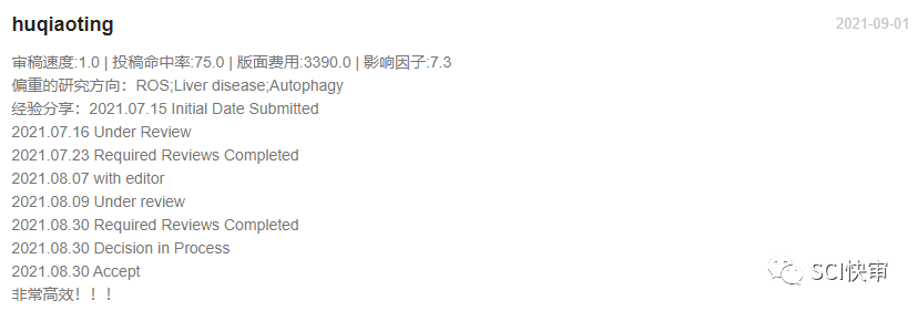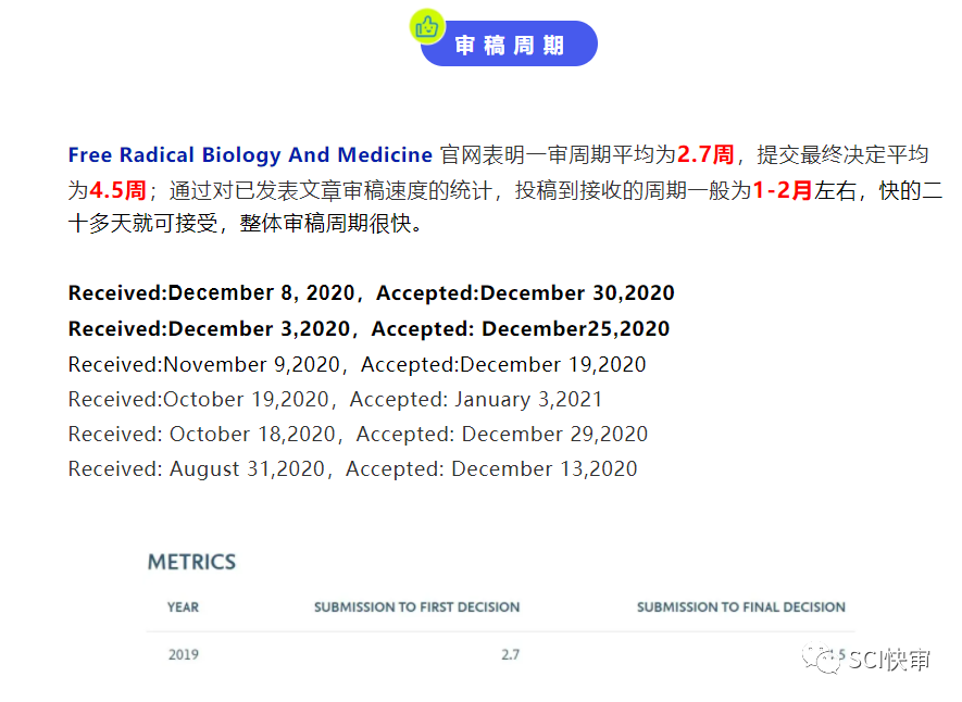 Free Radical Biology And Medicine每年出版12期;官网表明2021年从提交稿件到第一次决定平均为2.4周,从提交到最后编辑决定平均为3.8周;通过对近期已发表文章审稿速度的抽样统计,大部分文章的审稿周期都是在1-2个月左右便可接受,最快的不到1个月就可以接受!慢的也有需要4个多月,不过从数据来看也可能是返修时间比较长的关系,审稿周期整体属于比较快的。跟去年的对比,审稿周期有加快了一点点。