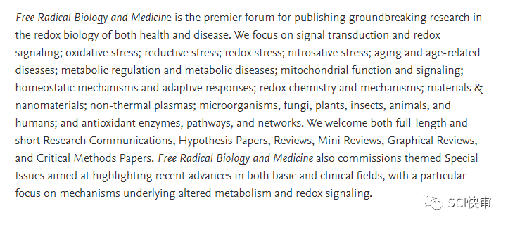 Free Radical Biology And Medicine是发表在健康和疾病的氧化还原生物学开创性研究的首要论坛。收稿范围较广,专注于: