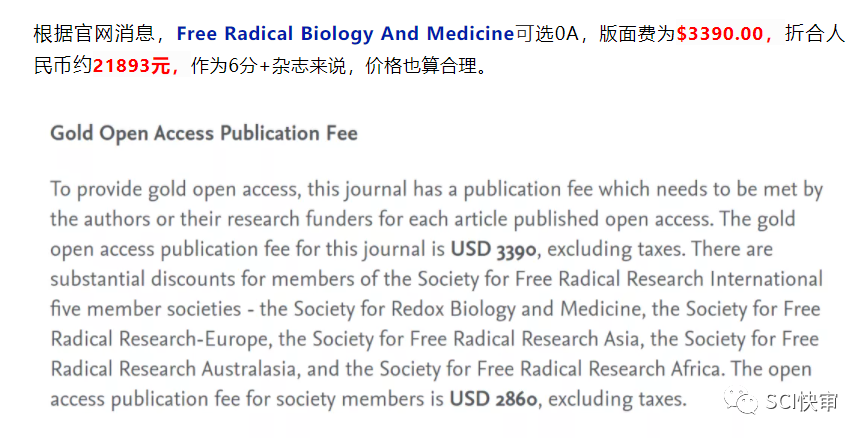 根据官网消息,在Free Radical Biology And Medicine是一本可以选择黄金开放获取的期刊,选择OA的话每篇文章收取3740.00 美元的文章处理费,折合人民币约为23774元,跟去年相比价格贵了一些。